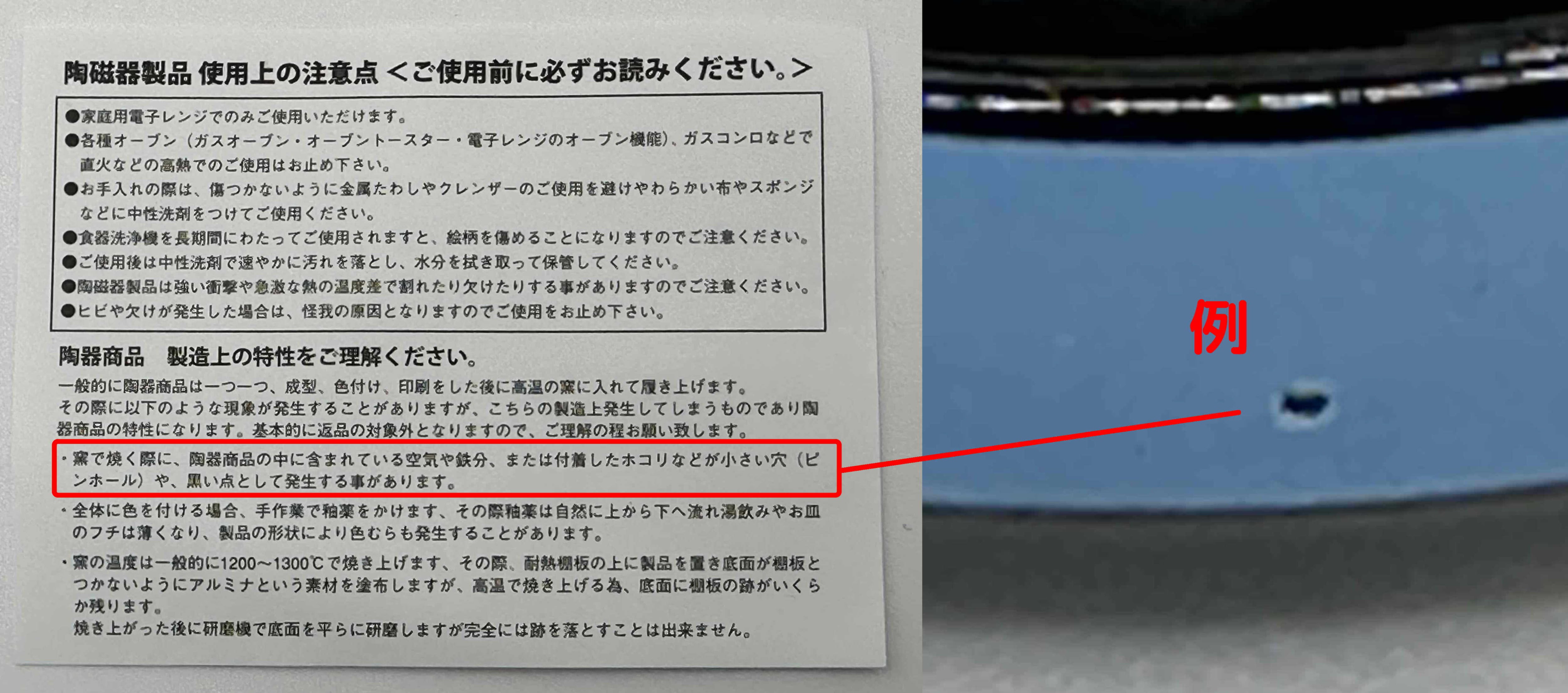 ・例として挙げたピンホール等は陶磁器の特性であり返品の対象外ではありますが、複数存在する等の場合は、ご相談ください。